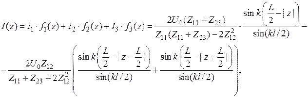 По найденному токовому распределению, на основе ранее найденного соотношения (4.2.) легко найти диаграмму направленности, которая будет комбинацией трех функций с теми же коэффициентами.