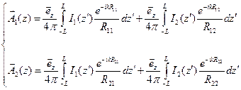 Основываясь на тех же допущениях, что и при выводе уравнения Поклингтона одиночного вибратора (т.е. наличие сильного скин-эффекта, приближение тонкого провода) векторный потенциал на поверхности первого и второго вибратора можно привести к виду: