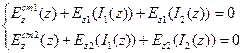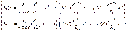 В точном соответствии с той же последовательностью действий, что и при выводе уравнения Поклингтона одиночного вибратора теперь следует записать пару граничных условий относительно касательной компоненты электрического поля на поверхности первого и второго вибраторов: