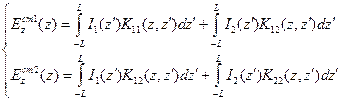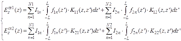 - касательные компоненты на поверхности второго вибратора, обусловленная теми же токами. Из системы 9.4 вытекает окончательная системы связанных интегральных уравнений типа Поклингтона относительно токов в первом и втором вибраторах: