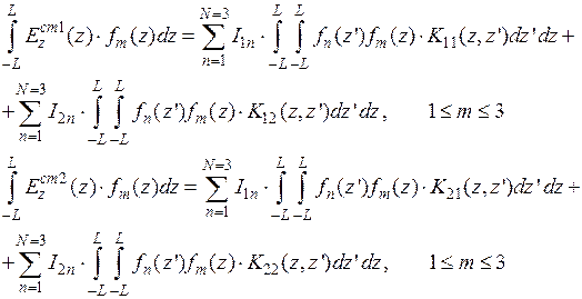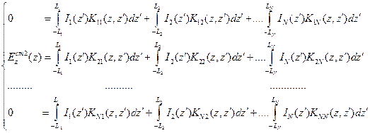 Нулевые значения стороннего электрического поля во всех строчках системы (9.10) кроме второй объясняются отсутствием возбуждающего источника во всех элементах кроме активного (второго). Физический смысл системы интегральных уравнений (9.10) заключается в том, что каждая строчка – это запись граничного условия для касательной компоненты электрического поля на поверхности каждого вибратора, причем каждый интеграл в правой части любой строки системы (9.10) - это вклад в поле на поверхности одного из вибраторов от каждого из