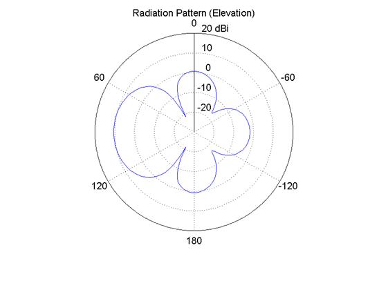 Результаты решения системы и вычисления ДН решетки из двух активных вибраторов представлены на рис. 9.10-9.12. Форма ДН существенно зависит от соотношения фаз генераторов. При синфазном возбуждении форма ДН мало меняется в азимутальной плоскости, за исключением некоторого узкого интервала частот. ДН представлена на рис.9.10. При сдвиге фаз между генераторами 90 град ДН приобретает выраженную направленность, таким образом можно реализовать управление положением главного лепестка ДН электронным образом в вибраторных малоэлементных антенных решетках. Гораздо проще реализовать направленное излучение в антеннах «волновой канал», в которых возбуждается только один элемент, а остальные (пассивные) возбуждаются через электромагнитную связь, причем фаза и амплитуда в них существенно зависит от геометрии их взаимного расположения.