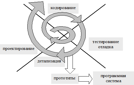 Соответственно следующая модель, которая на сегодняшний день является достаточно популярной – это спиральная модель организации жизненного цикла. Суть ее заключается в следующем: проект с точки зрения реализации разбивается на последовательность промежуточных результатов или прототипов, соответственно для получения каждого из прототипов, мы проходим этап проектирования прототипа, кодирования, тестирования, отладки. После получения прототипа предполагается этап детализации проекта. В результате которого мы обозначаем следующий прототип или уточняем спецификации и т.д. и вот эта спираль идет до тех пор пока один из прототипов не становится конечной программой, соответственно количество итераций может быть либо детерминированным (это зависит уже от организации взаимодействия заказчика и исполнителя), либо в пределах разумного не ограниченным.