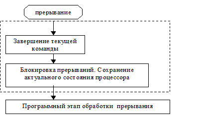 . На аппаратной стадии обработки прерывания происходит следующее: завершается выполне6ние текущей команды, в том случае если прерывание не связано с выполнением текущей команды (предположим, пришло внешнее прерывание), происходит блокировка прерываний. Обработка прерываний предполагает приостановку текущей программы, и при этом после обработки прерываний возможно продолжение текущей программы, т.е. как правило, программа после возникновения прерывания продолжает свое исполнение. При возникновении прерывания в системы должны быть предусмотрены средства, которые, с одной стороны, позволили бы вызвать программу, которая будет обрабатывать возникшее прерывание. С другой - сохранили бы возможность продолжения программы после обработки прерывания, так как существуют регистры, которые при обработке прерывания нужно либо не трогать, либо как-то сохранить. В модельной аппаратуре компьютера имеются средства сохранения актуального состояния процессора, которые сохраняют все необходимые для загруженной программы регистры в специальном регистровом буфере. Чтобы не возникла ситуация, когда информация скидывается в этот буфер, но не успевает обработаться, а в это время появилось еще одно прерывание и скидывается поверх еще – то включается режим блокировки прерываний. В режиме блокировки прерываний происходит следующее: либо возникающие в системе прерывания игнорируются, либо их обработка откладываются до тех пор, пока не будет обработано предыдущее прерывание. После блокировки происходит аппаратный сброс части регистров в буфер и начинается программный этап обработки прерываний.