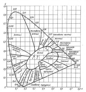 Рис. 1.4. Области различных цветов на цветовом графике МОК.