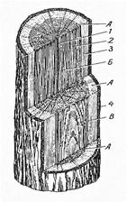 | Рис. 1.6. Разрезы ствола дерева а – торцовый, б – радиальный, в – тангенциальный, 1 – седцевина, 2 – ядро, 3 – заболонь, 4 – кора. |