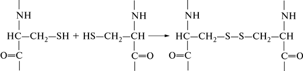 Дисульфидная связь. Пептидные цепочки аминокислот (в белке их может быть одна, две или несколько) могут быть сшиты внутри себя или между собой за счет образования ковалентной дисульфидной связи –S–S– между сульфгидрильными группами –SН, расположенными в полипептидной цепи цистеинов: