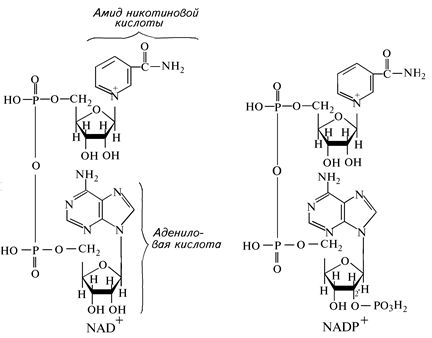 Функциональной частью обоих коферментов анаэробных дегидрогеназ является никотинамид — амид никотиновой кислоты. Это витамин РР — никотиновая кислота в виде своего амида. В состав данных коферментов входят также азотистое основание аденин, два остатка сахара — рибозы и два (в NAD+) или три (в NADP+) остатка фосфорной кислоты (рис. 9).