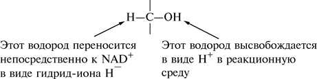 Механизм действия этих дегидрогеназ до конца не установлен. Использование меченых 2Н-спиртов и изучение их окисления под действием дегидрогеназ NAD показало, что дегидрогеназы катализируют прямой перенос к NAD+ водорода, который связан с углеродом спиртовой группы. Многие наблюдения позволяют рассматривать процесс биологического окисления, т. е. дегидрирование, как удаление гидрид-иона (Н–) вместе с протоном (Н+), а не удаление двух атомов водорода. Водород, присоединенный к кислороду спирта, высвобождается в реакционную среду в виде протона (Н+).