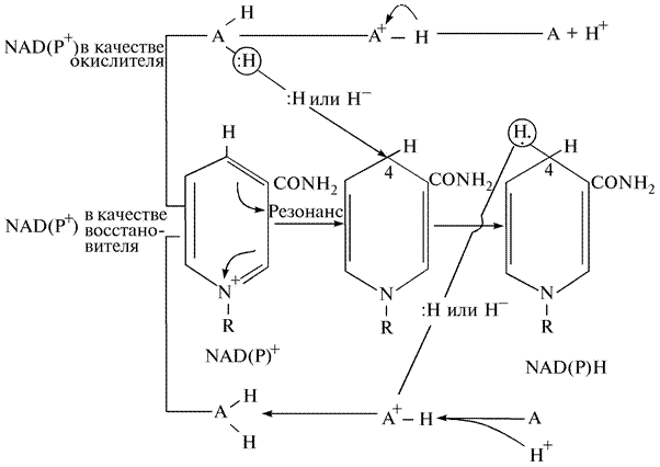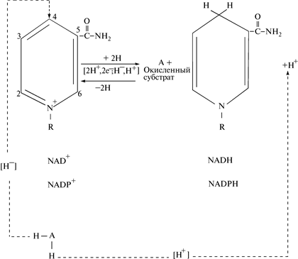 В присутствии восстановленного субстрата АН2 — донора электронов и соответствующей дегидрогеназы пиридиновое кольцо кофермента восстанавливается путем связывания в 4-м положении одного протона и двух электронов; второй протон отщепляется в реакционную среду. Поэтому NAD+ и NADP+ являются акцепторами электронов, хотя на самом деле переносится гидрид-ион водорода (Н–). В обратной реакции NADH + H+ и NADPH + H+ выступают в роли донора электронов (рис. 10): действуют в качестве кофермента в реакции ферментативного дегидрирования (на рисунке изображена никотинамидная часть молекулы NAD+ или NADP+, остальная ее часть обозначена буквой R).