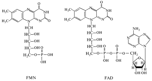 Простетической группой этих ферментов являются флавинмононуклеотид (FMN) и флавинадениндинуклеотид (FAD). В состав FMN входит азотистое основание диметилизоаллоксазин, вместо сахара рибозы — спирт рибит и фосфорная кислота. В состав FAD входит FMN, соединенный с другим нуклеотидом, содержащим азотистое основание — аденин, сахар—рибозу и фосфорную кислоту. Простетическая группа флавопротеинов содержит рибофлавин — это диметилизоалаксазин соединенный со спиртом рибитом (витамин В2)(рис. 12).