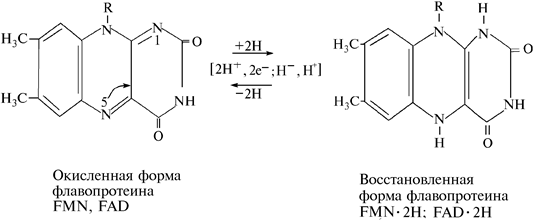 Коферментом флавопротеинов в большинстве случаев служит FAD, реже — FMN. Эти коферменты функционируют в качестве прочно связанных с белками—ферментами простетических групп. Это их отличает от NAD+ и NADP+, которые могут существовать в клетке в свободном виде, диффундируя от одного белка-фермента к другому. В катализируемых флавопротеинами реакциях изоаллоксазиновое кольцо служит промежуточным переносчиком водорода, отщепляемого в ходе окислительно-восстановительной реакции.