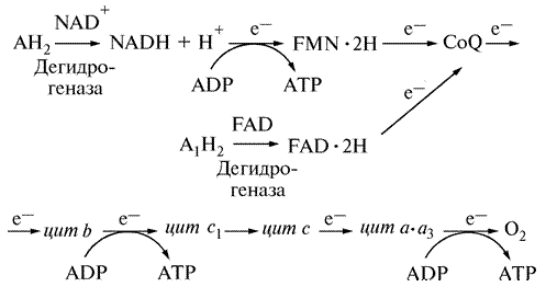 В длинной дыхательной цепи в трех пунктах происходит сопряжение переноса электронов (окисления) и фосфорилирования. Первым этапом является перенос электронов от восстановленной анаэробной дегидрогеназы NADH + Н+ к флавиновой дегидрогеназе — FMN. Резкий скачок падения энергии приводит к образованию молекулы АТР. Второй точкой сопряжения является переход электронов от цитохрома b на цитохром с 1. Третья молекула АТР выделяется, когда цитохромоксидаза (комплекс цитохромов а · а 3) передает электроны кислороду воздуха. В короткой дыхательной цепи выделяется две молекулы АТФ.