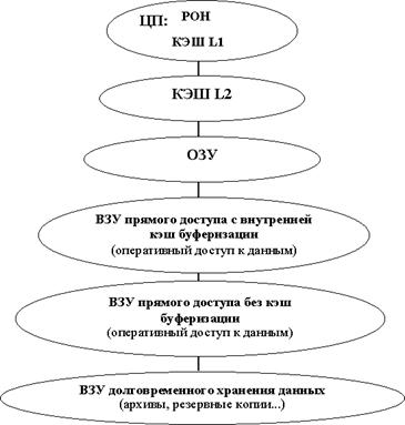 Данная иерархия строится с позиций близости к ЦП, стоимости памяти и системной составляющей. Т. е. есть ЦП и элементами памяти в ЦП являются регистры общего назначения и КЭШ 1-го уровня. Следующий уровень– это уровень устройства, которое называется КЭШ 2-го уровня, которое находится между ЦП и ОЗУ, т.е. обычно это устройство, которое быстрее ОП, но может быть медленнее и дешевле КЭШа 1-го уровня, а также может обладать немножко большими размерами чем КЭШ 1-го уровня, соответственного схема работы с КЭШем 2-го уровня аналогично схеме работы с КЭШем 1-го уровня. по иерархии уровень после уровня ОЗУ – это уровень внешнего запоминающего устройство с внутренней КЭШ-буферизацией. Т.е. это устройства, аппаратное управление которых имеет КЭШ буферизации, т.е. это уже менее эффективно, чем ОП, но достаточно эффективно, потому что опять-таки за счет внутреннего кэширования (при той же схеме кэширования, которая имеет место в схеме ЦП - ОЗУ), сокращается реальное количество обращений к устройству и тем самым получается существенное повышение производительности работы устройства. Следующий уровень - внешнее запоминающее устройство прямого доступа без КЭШ-буферизации. Это устройства существенно менее эффективные, но также предназначенные для оперативного доступа к данным, т.е. это устройства, которые обычно используются в программе для организации внешнего хранения и доступа за данными, соответственно по производительности они могут быть разными, но для каких-то ситуаций категории этих двух устройств не принципиальны. Последним уровнем этой иерархии является уровень внешнего запоминающего устройства долговременного хранения данных. Т.е. это устройства, предназначенные для архивирования и долговременного хранения информации, к этим устройствам могут относиться и как устройства прямого доступа, и устройства последовательного доступа. Суть иерархии: на вершине находятся самые высоко скоростные, которые, в свою очередь являются также и самыми дорогими устройствами, но спускаясь вниз, мы получаем устройства менее дорогие, но обладающие более худшими показателями по скорости доступа, за счет всей системы предусматриваются достаточно большие элементы сглаживания дисбаланса в производительности каждого из типов этих устройств.