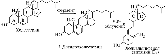 Витамины группы D (кальциферол). Эта группа витаминов представлена в виде нескольких соединений, отличающихся по строению и биологической активности. Для человека и животных активными препаратами являются витамины D2 – эргокальциферол и D3 – холкальциферол. В растениях содержатся провитамины витаминов группы D – фитостерины, которые под действием ультрафиолетовых лучей с длиной волны 280...310 нм в организме животных и человека превращаются в витамины группы D.