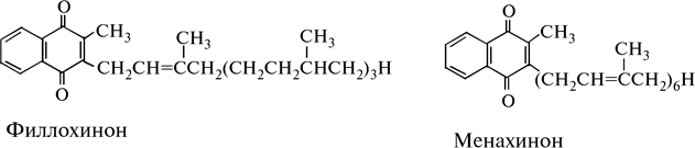 Витамины группы К. Витамин К (нафтохинон) представлен двумя соединениями. К группе витаминов К относятся два типа хинонов (витамины К 1 и К 2) с боковыми цепями, представленными изопреновыми звеньями, в основе циклической структуры которых лежит кольцо 1,4-нафтохинона. Витамин К1 – это филлохинон-4, а витамин К2 – менахинон-6 (рис. 19). Витамин К1 впервые выделен из люцерны, витамин К2 – из рыбной муки, где он синтезировался микроорганизмами.