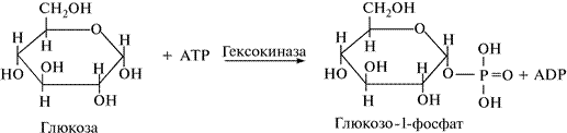 Донор фосфорной кислоты — АТР, в молекуле которой расщепляется высокоэнергетическая связь. Под действием фермента гексокиназа остаток фосфорной кислоты переносится на глюкозу к первому углеродному атому (рис. 29).