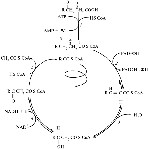 1 — ацил-СоА-синтаза; 2 — ацил-СоА-дегидрогеназа; 3 — еноил-СоА-гидратаза; 4 — 3-гидроксиацил-СоА-дегидрогеназа; 5 — ацетил-СоА-ацилтрансфераза