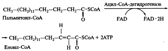 На втором этапе (реакция 2) поступившие в митохондрии СоА-эфиры жирных кислот подвергаются дегидрированию (окислению) по a- и b-атомам углерода под действием фермента ацил-СоА-дегидрогеназы. В результате образуется двойная связь. Отщепляемые атомы водорода переносятся на прочносвязанную простетическую группу фермента ацил-СоА-дегидрогеназы. Восстановленная форма ацил-СоА-дегидрогеназы передает затем пару электронов по короткой дыхательной цепи кислороду, при этом образуются 2 молекулы АТР путем окислительного фосфорилирования ADP.