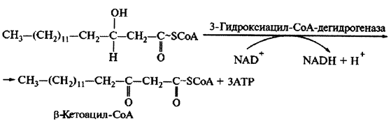 На четвертом этапе (реакция 4) происходит дегидрирование (окисление) b-гидроксиацил-СоА под действием 3-гидрокисацил-СоА-дегидрогеназы с образованием b-кетоацил-СоА. Специфическим акцептором электронов служит NAD+. Образовавшийся в этой реакции NADH + H+ дегидрогеназы отнятый водород передается кислороду воздуха по длинной дыхательной цепи. На каждую пару электронов, переходящих по цепи переноса электронов от NADH + H+ к кислороду, образуется 3 молекулы АТР.
