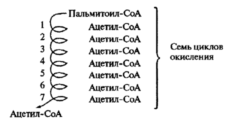 Образовавшиеся СоА — производные жирных кислот (ацил-СоА), также как и ацетил-СоА, представляют собой высокоэнергетические соединения: их гидролиз до свободной жирной кислоты и СоА-SH сопровождается выделением энергии 31,4 кДж/моль. Далее происходит последовательное отщепление двухуглеродных фрагментов в виде ацетил-СоА от карбоксильного конца цепи жирной кислоты. Каждый двухуглеродный фрагмент отщепляется в результате цикла ферментативных реакций.