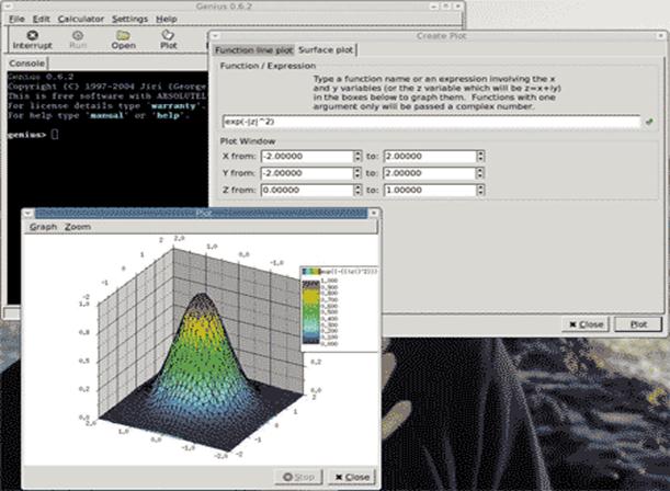 Программа KOctave по сути представляет собой более продвинутый графический интерфейс для системы Octave (Рисунок 2.13). В результате использования KOctave система Octave становится полностью похожей на MatLab. Простенькая математическая программа Genius, естественно, не может поспорить по мощности с именитыми конкурентами, но идеология математических преобразований у нее сходна с MatLab и Maple. Распространяется Genius тоже на условиях открытой лицензии с исходным кодом (OpenSource) (Рисунок 2.14)