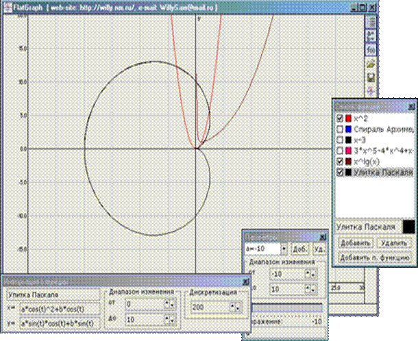 FlatGraph - программа для построения графиков функций (обычных и параметрических) с расширенными возможностями (Рисунок 2.33). Дифференцирование любого порядка (с упрощением). Построение касательных к графику. Программа рассчитана как на неопытного, так и на профессионального пользователя, т.к она совмещает в себе интуитивный интерфейс с профессиональными функциями.