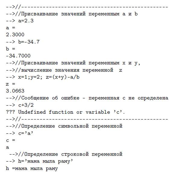 В рабочей области Scilab можно определять переменные, а затем использовать их в выражениях. Любая переменная до использования в формулах и выражениях должна быть определена. Для определения переменной необходимо набрать имя переменной, символ = и значение переменной.