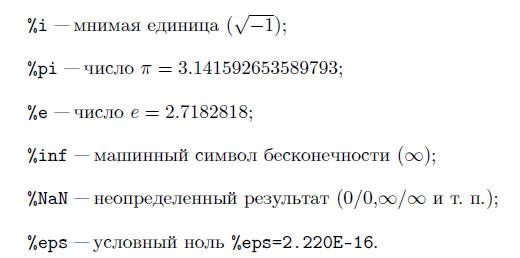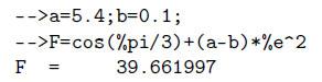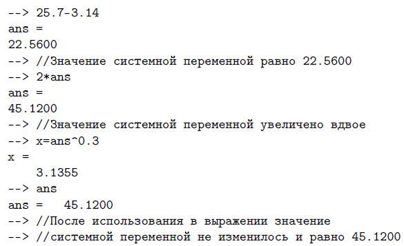 Результат последней операции без знака присваивания хранится в переменной ans. Другие системные переменные в Scilab начинаются с символа %: