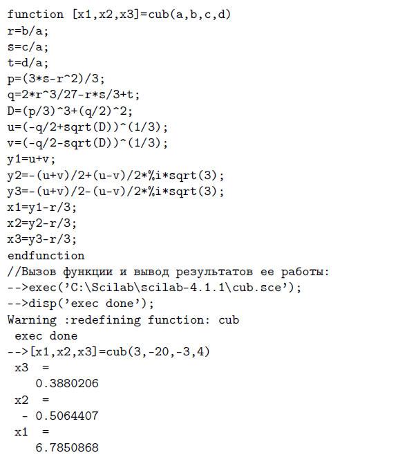 Далее представлен список команд, реализующий описанный выше способ решения кубического уравнения: