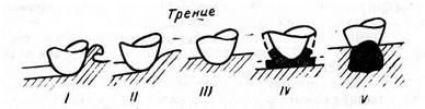 2. Оттеснение материала пластическое вследствие повторного деформирования и передеформирования (рис. 6.1, II). Выступающие частицы материала гонят перед собой волну. При многократном передеформировании происходит отслаивание частиц поверхности.