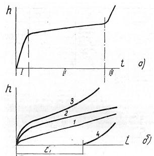 Протекание процесса износа во времени характеризуется закономерностями, называемыми типичными кривыми износа. В общем случае типичная кривая износа имеет вид, изображенный на рис. 6.3. На кривой можно выделить три участка, характеризуемые различной интенсивностью изнашивания.