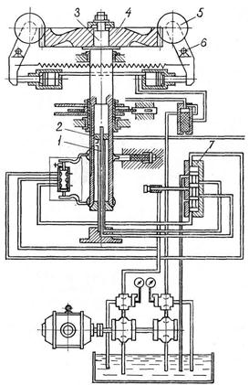 Заготовка 4 крепится на штоке 3, который имеет возвратно-поступательное движение. Усилие обкатки регулируется и устанавливается рычагами 6.