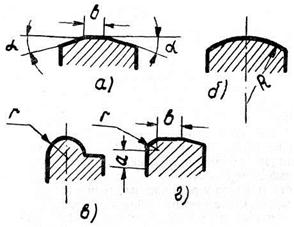 б) со сферическим контуром радиуса R; в) специальный канавочный с профилем радиуса r; г) с комбинированным профилем.
