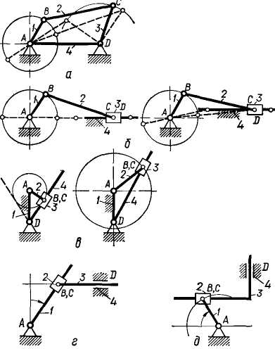 В зависимости от характера движения и назначения звенья имеют определенные названия. Например, в механизме шарнирного четырехзвенника (рис. 1.1, а) и его модификациях, являющихся основой многих машин и приборов, звено 1, совершающее полный оборот, называется кривошипом; звено 2, совершающее сложное плоскопараллельное движение,— шатуном; звено 3, совершающее качательное движение,— коромыслом; неподвижное звено 4 является стойкой. На рис. 1.1 штриховыми линиями изображены крайние положения механизма.