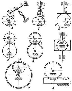 Широкое применение в технике нашли также кулачковые механизмы, отличающиеся большим разнообразием форм кулачков (рис. 1.2, а, б, в, е), фрикционные (рис. 1.2, г) и зубчатые механизмы (рис. 1.2, д, ж, з), типы которых определяются количеством, формой и взаимным расположением звеньев.
