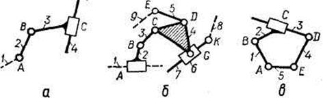 Кинематическая цепь. Звенья, соединенные между собой кинематическими парами, образуют кинематическую цепь. Кинематические цепи могут быть простыми (рис. 1.4, а), сложными, если хотя бы одно звено входит больше чем в две кинематические пары (рис. 1.4, б), замкнутыми (рис. 1.4, в) и незамкнутыми, если есть звенья, входящие в одну кинематическую пару (рис. 1.4, а).