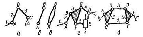 Таким образом, группа может состоять из двух подвижных звеньев и трех кинематических пар пятого класса (рис. 1.7, а), четырех подвижных звеньев и шести пар пятого класса (рис. 1.7, г, д) и т. д.