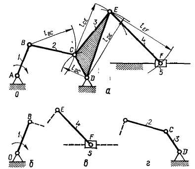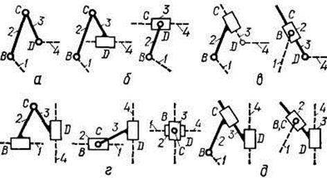 Наиболее распространенными являются группы второго класса, которые разделяют на пять видов. Вид группы второго класса определяется в зависимости от числа и относительного расположения поступательных и вращательных кинематических пар в ней (рис. 1.8, а — д).
