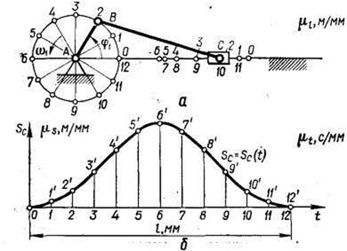 По оси ординат откладывают линейное перемещение Sc ведомого звена в масштабе \is (м/мм) или угловое перемещение φ в масштабе μ ф (рад/мм) для механизмов с вращающимся ведомым звеном.