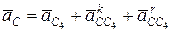 Для нахождения ускорения любой точки звеньев 2 и 3 дополнительно надо знать ускорение хотя бы одной точки на каждом из этих звеньев. В качестве такой точки следует использовать центр шарнира С, являющийся общей точкой для звеньев 2 и 3. Рассматривая вращательное движение звена 2 вокруг точки В и поступательное — звена 3 относительно звена 4, записываем следующие векторные уравнения: