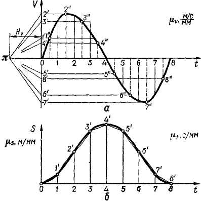 , выбранным по оси абсцисс на расстоянии Нv от начала координат. Затем в пределах соответствующих делений по оси абсцисс графика s = s (t) (рис. 2.5, б) последовательно проводят линии, параллельные лучам, исходящим из точки л. Очевидно, что масштаб перемещений интегрального графика