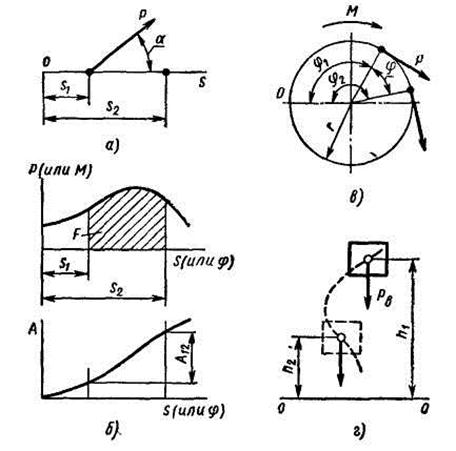 Работа на участке пути s2—s1 переменной силы Р = f (s), направление которой совпадает с направлением скорости, при прямолинейном поступательном движении (рис. 32, б)
