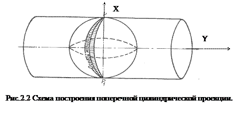 Для того, чтобы воспользоваться прямоугольной системой координат, необходимо земной эллипсоид развернуть в плоскость. Для изображения сферической поверхности Земли на плоскости существуют различные картографические проекции. В геодезии применяется поперечно — цилиндрическая проекция. Суть которой состоит в следующем. Поверхность сферы разбивают меридианами через 60 на зоны каждая из которых отдельно проектируется на боковую поверхности цилиндра (рис 2.2). Разрезав цилиндр по образующей, проходящей через земные полюса, получают изображение сферической поверхности на плоскости (рис 2.3). На полученном изображении осевой меридиан зоны и экватор, - взаимно перпендикулярные прямые линии а остальные меридианы и параллели – кривые. Искажения размеров длин линий вблизи осевого меридиана минимальные и возрастают по мере удаления к краям. Линия на поверхности длиной D при изображении ее на плоскости получит искажение ∆D, которое можно вычислить по формуле