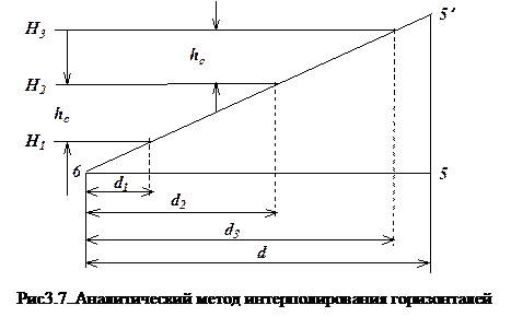 Пусть линия 5-6¾проекция линии 5-6¢ местности на горизонтальную плоскость в данном масштабе. Точки 5 и 6 — соседние точки. Пусть отметка точки 5 равна Н5, а точки 6 равна Н6. Н1,Н2,Н3 - отметки секущих горизонтальных плоскостей с отметками кратными высоте сечения рельефа. Горизонтальное проложение линии 6-5 равно d. Из решения подобных прямоугольных треугольников имеем
