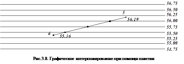 Для интерполирования по линии 5-6 накладывают палетку на план так, чтобы точка 5 заняла положение между линиями с отметками 56.00 и 56.25 соответственно своей отметке 56.19 м (рис.3.8). В точке 5 иглой измерителя прокалывают кальку и поворачивают ее вокруг иглы так чтобы точка 6 расположилась между линиями с отметками 55.25 и 55.50 соответственно своей отметке 55.36. Закрепив в этом положении палетку, осторожно прокалывают остро отточенным карандашом пересечения линий 55.50, 55.75 и 56.00 с линией сетки квадратов 5-6. Аналогичным образом производится интерполирование и по другим отметкам. Соединив точки с одинаковыми отметками плавными линиями, получим горизонтали.