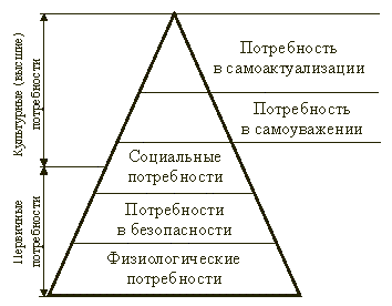 Одной из самых популярных является концепция потребностей А. Маслоу, основанная на результатах многочисленных психологических исследований. Потребности - рассматриваются как осознанное отсутствие чего-либо, вызывающее побуждение к действию. Подразделяются на первичные, характеризующие человека, как биологический организм, и культурные или высшие, характеризующие человека как социальное существо и личность.