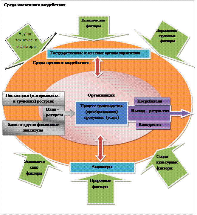 Факторы косвенного воздействия представлены на схеме в виде широких стрелок одностороннего воздействия. К данной группе факторов относят состояние экономики, природные, социально-политические, нормативно-правовые и т.д.