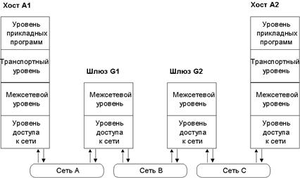 Компьютерные системы могут передавать данные только внутри той сети, к которой они подключены. Поэтому передача дейтаграмм из одной сети в другую идёт через шлюзы – от одного к другому. Внутри хоста данные проходят пути от уровня прикладных программ до уровня доступа к сети (и обратно). Дейтаграммы, которые переправляет шлюз, поднимаются только до межсетевого уровня. На этом уровне протокол IP, узнавая адрес получателя данных (на протяжении всего пути следования этот адрес не меняется – меняются промежуточные машины), принимает решение отправить дейтаграмму в одну из сетей, к которым подключен.