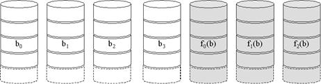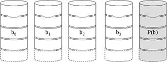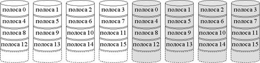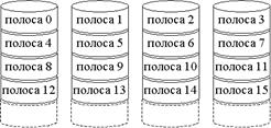 Все пользовательские и системные данные рассматриваются как хранящиеся на одном логическом диске. Диск делится на полосы, которые могут быть физическими блоками, селекторами или другими единицами хранения. Полосы циклически размещаются на последовательных дисках массива. В n-дисковом массиве первые n полос распологаются как первые полосы каждого из n дисков; вторые n- как вторые полосы каждого из n дисков и т.д.